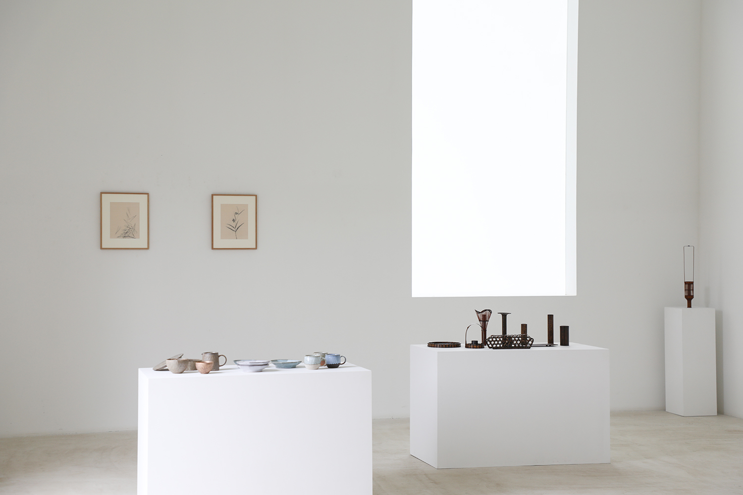 心地よい秋風が吹き抜けるギャラリーには、手びねりの陶器や漆器、竹の花籠など、どれも丁寧な手仕事が見て取れるうつくしい作品が並びます。 evam eva yamanashi|形OPEN:11:00 – 18:00CLOSED:火・水・木