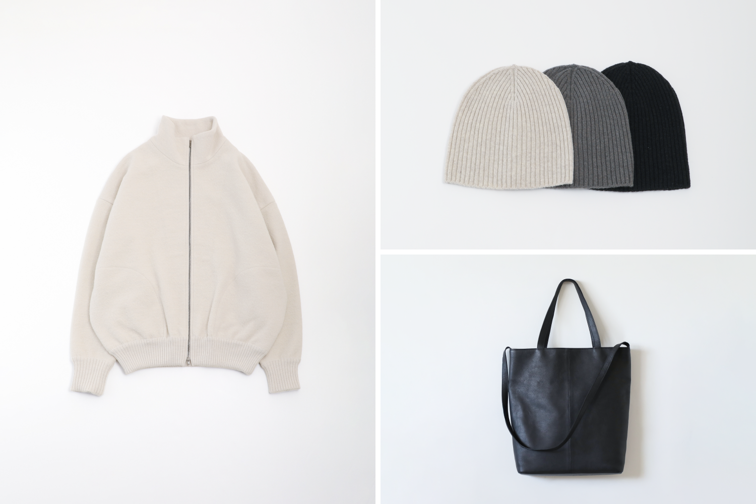 プレスウールで仕立てたブルゾン、バギーパンツやレザーバッグの限定アイテムをはじめ、ハンカチや帽子など贈りものにも最適なアイテムが並びます。