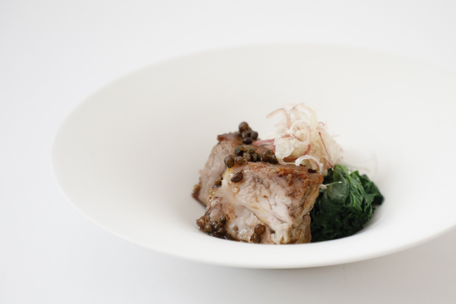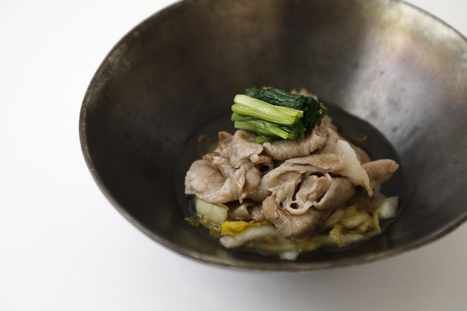 富士桜ポークには、発酵白菜の餡をかけて。滋味深くまろやかな味わいです。