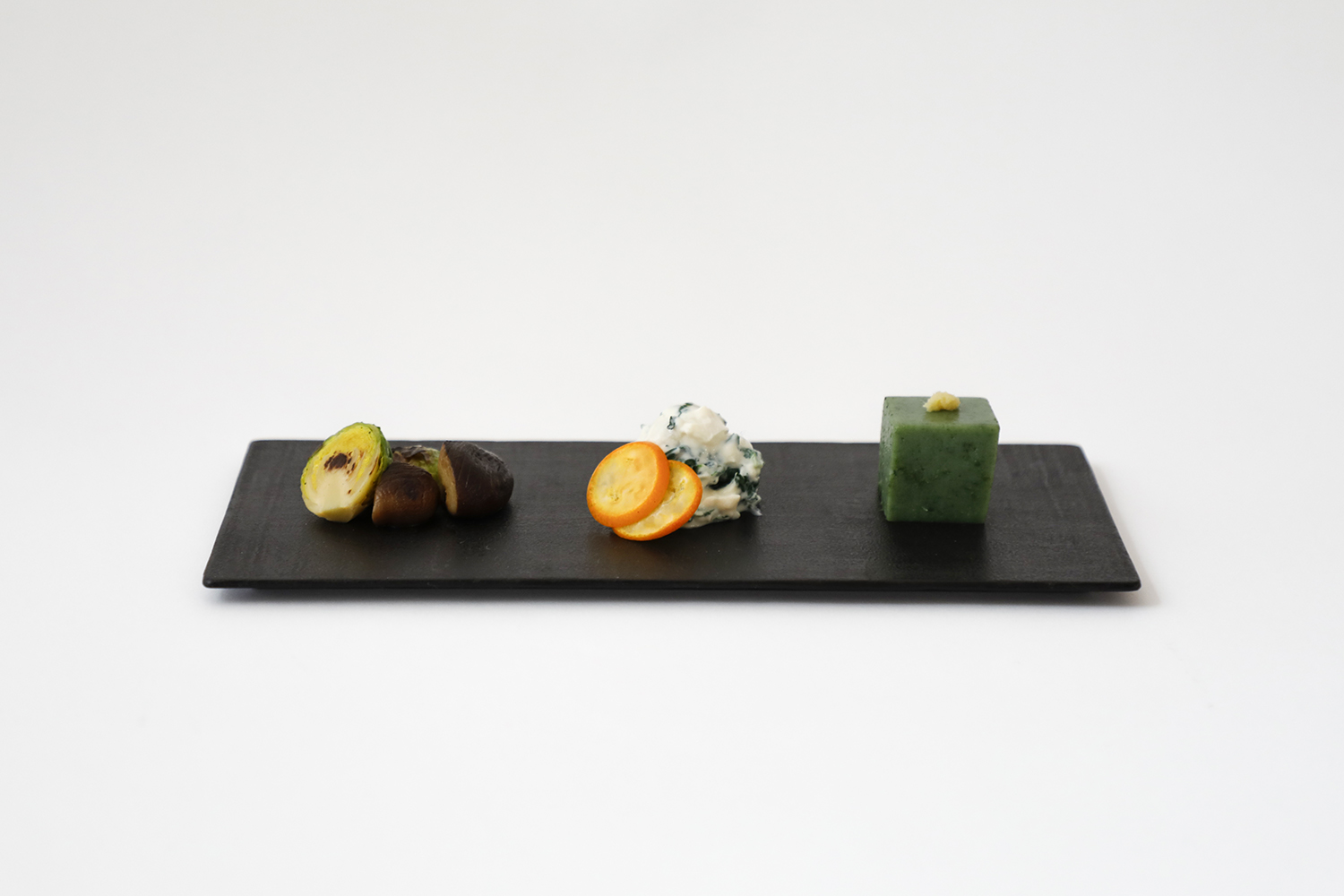 芽キャベツと椎茸のお浸し、金柑と独活、春菊の白和え、蓬豆腐