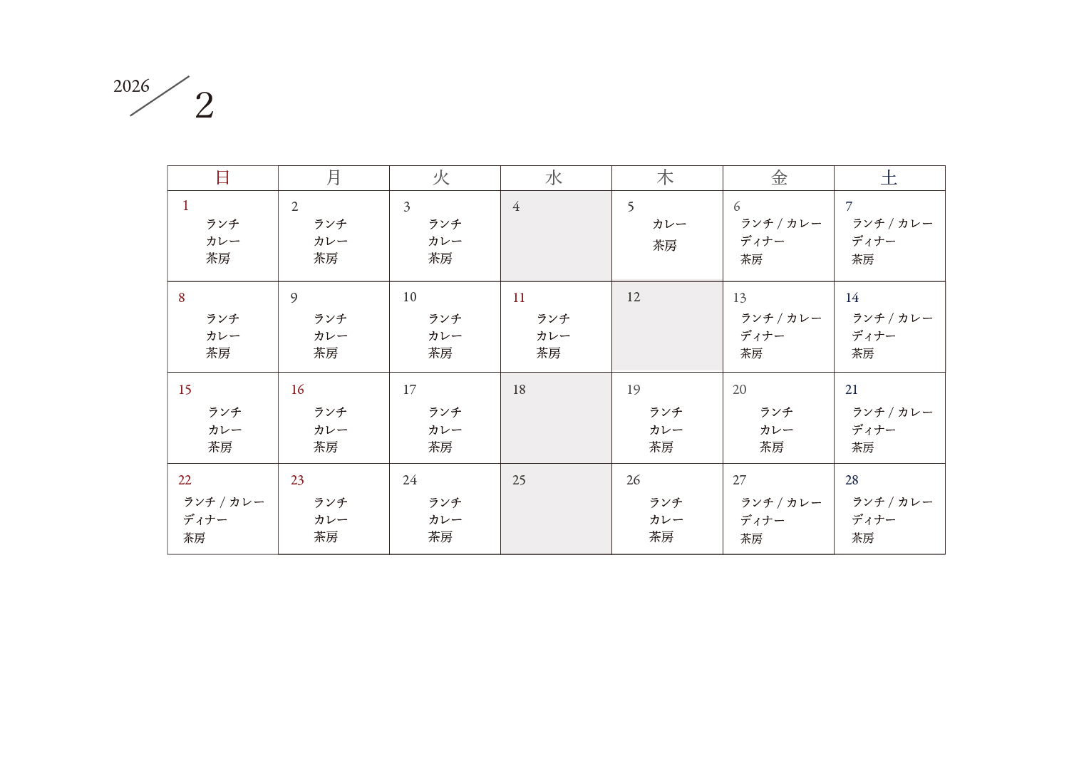 5日(木)はランチをお休みさせていただき、カレーのみの提供とさせていただきます。また、11日(水・祝)は営業し、翌12日(木)は休業となります。