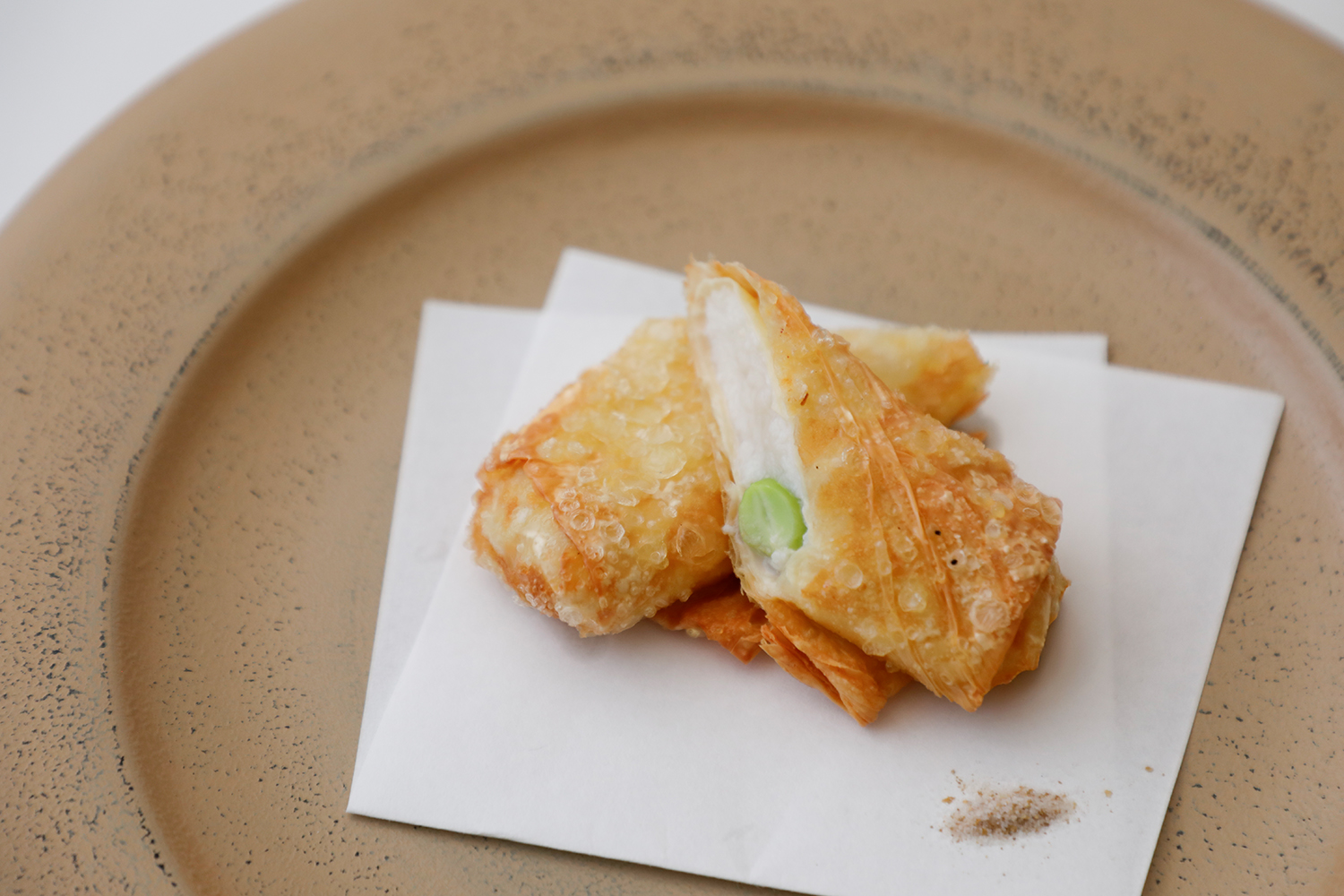 湯葉で巻いた帆立とそら豆をパリッと揚げました。ちょうどよい火加減でやわらかく、甘みのある味わいです。