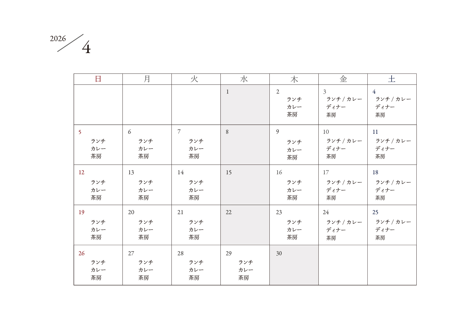 4月29日(水・祝)は営業、翌日30日(木)を臨時休業させていただきます。